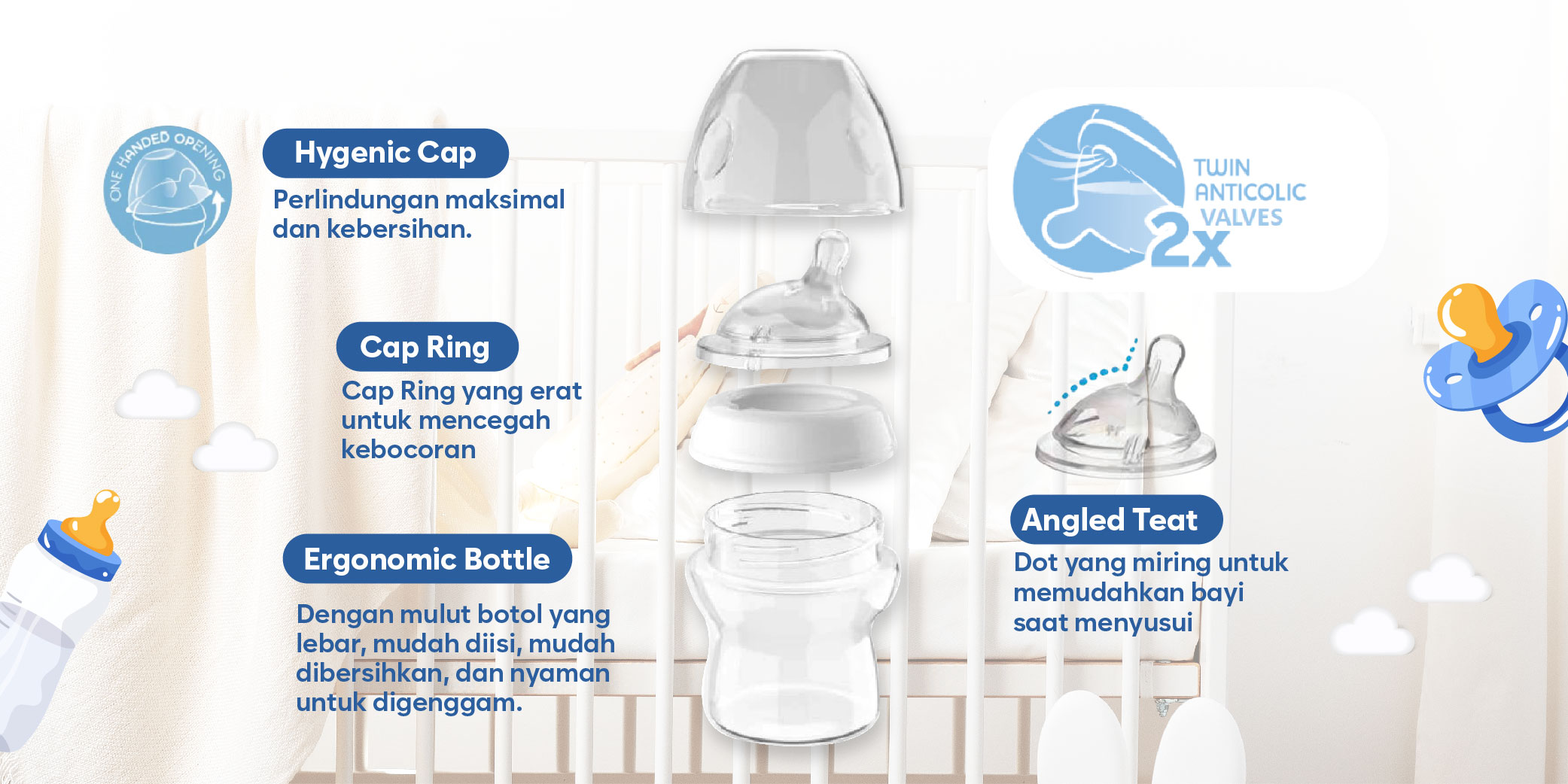 Chicco memahami pentingnya kenyamanan perut bayi, sehingga botol susu Natural Feeling dilengkapi dengan katup anti-kolik ganda. Katup ini berfungsi untuk mencegah bayi menelan udara saat menyusu, yang merupakan salah satu penyebab utama kolik dan kembung pada bayi. Dengan fitur ini, orang tua bisa lebih tenang saat menyusui bayi menggunakan botol.